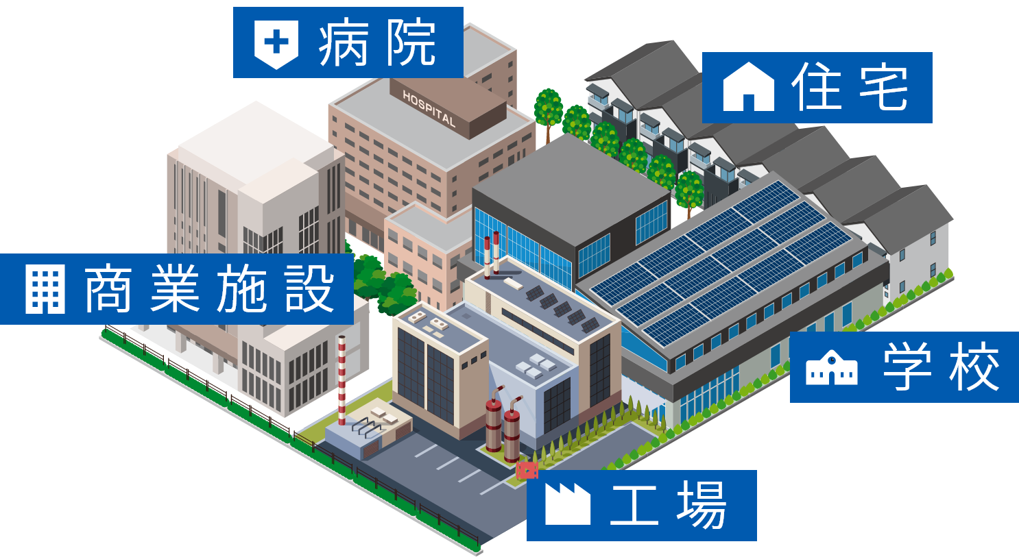 藤井産業は、街や暮らしのさまざまなシーンで活躍。社会・生活インフラの最適化、業務効率の向上、再生可能エネルギーへの転換まで、身近なところで安全、快適をサポートしています。